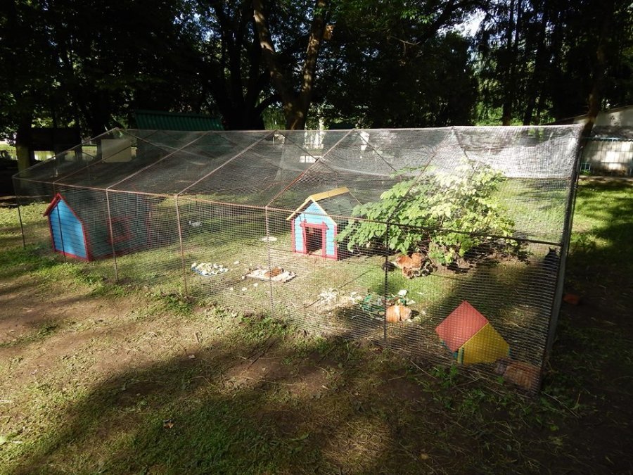 "Вухастики, відчувши простір, гасають вольєром. Зі свинками – повна ідилія))) Сюди ж днями поселили ще й квочку з 9-ма курчатами. Мама-курка ревно оберігає свої малюків. І може нагнати чотирилапих, якщо ті надто близько підходять до курчат. В цілому ж непорозумінь від сусідства одне одного немає. Ще один мешканець вольєру відучора – гусеня. Його знайшли у парку і принесли до нас