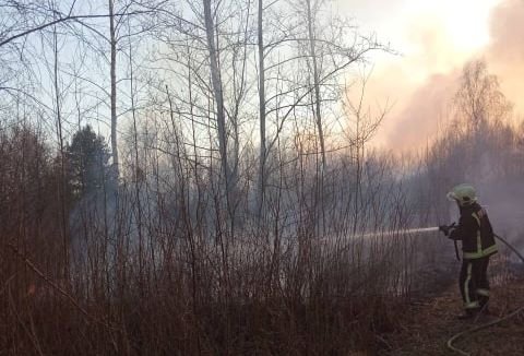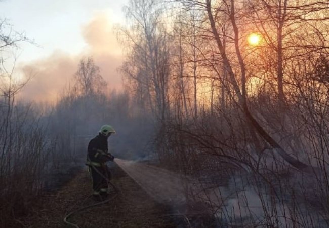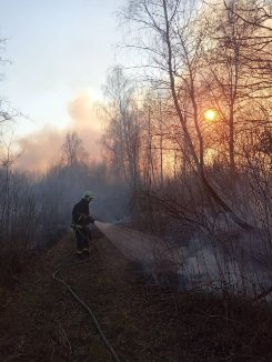 24 рятувальники борються з вогнем на торфянику, що спалахнув 7 квітня. З ними разом працюють для швидшої ліквідації пожежі і 6 працівників місцевої пожежної охорони села Залаззя.