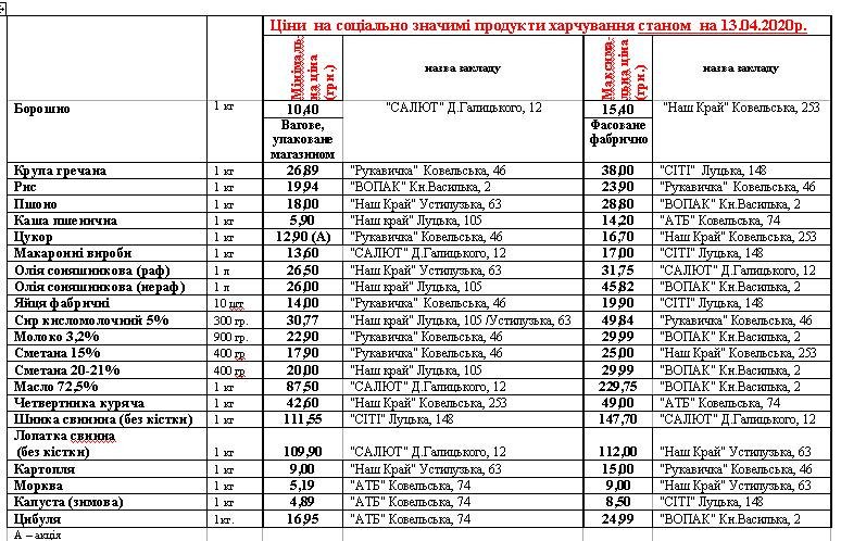 13 квітня управлінням економічного розвитку та інвестицій виконавчого комітету Володимир-Волинської міської ради проводився черговий моніторинг цін на соціально значимі продукти харчування, які реалізовуються у 8 супермаркетах міста.