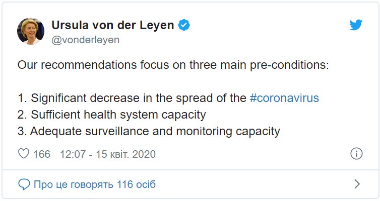 «Наші рекомендації фокусуються на трьох головних передумовах: суттєве сповільнення поширення коронавірусу, достатні спроможності системи охорони здоров’я та спроможності нагляду й моніторингу», - зазначила президент Єврокомісії Урсула фон дер Ляєн.