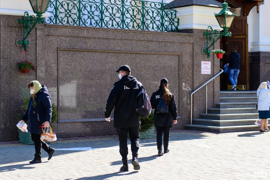 Першими священники освятили пасхальні наїдки для майже трьох десятків людей на території храму. Варто зазначити, що усі прихожани храму були у масках на дотримувалися дистанції. На території храму зробили спеціальну розмітку.