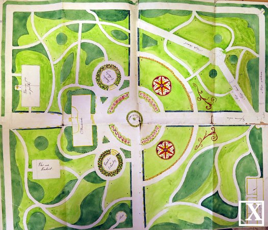 Схема саду неймовірно цікава. Намальована акварельними фарбами на пожовтілому від часу папері, вона все ж зберегла яскравість кольорів. Передбачені алеї з окремих порід дерев. Також є місце для крікету (!), футбольний майданчик, веранда для відпочинку, два оркестрові павільйони, альтанки, у правому нижньому куті – театральне приміщення (біля Вопаку), по центру – фонтан.