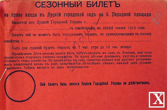 «Устроенный на бывшей Парадной площади городской садъ, со времени его устройства съ 1908 по 1913 г. оставался закрытымъ для публики. Въ 1913 г., уступая усиленнымъ ходатайствамъ жителей г. Луцка, Городская Дума постановленіемъ отъ 15 марта 1913 г. признала возможнымъ открыть садъ для посѣщенія его публикой, причемъ установила плату за сезонный билетъ съ семейства по 1 руб. и съ лицъ, не взявшихъ такового билета, по 5 копъ. съ человѣка за входъ», - йдеться у постанові.