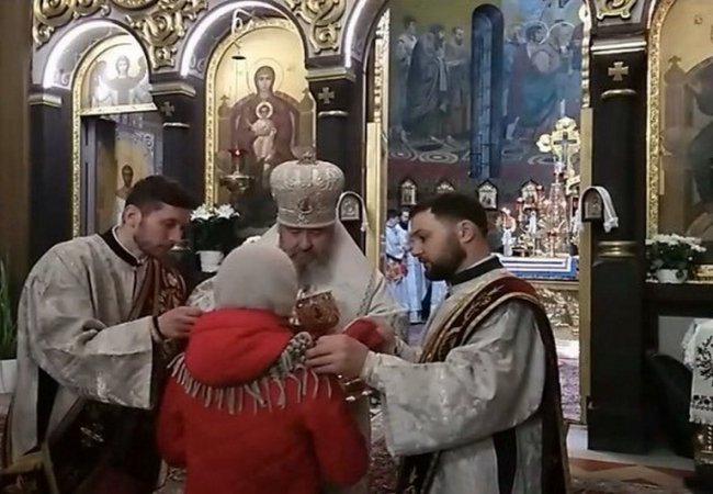 Читачі поділилися відео зі сторінки у фейсбук "Сайт Володимир-Волинсьбкої єпархії", де у прямому ефірі відбувалася трансляція служби у соборі. На одному із відео зафіксовано момент причастя: прихожан причащали з однієї ложки.