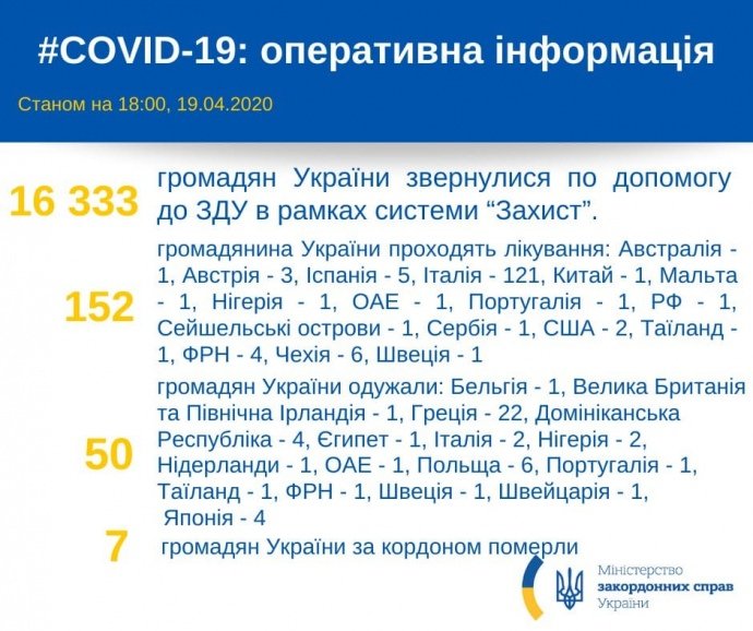 Станом на 18 годину 19 квітня за кордоном від коронавірусу вилікувалися 50 громадян України, померли – 7.