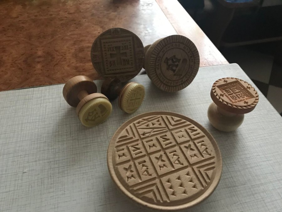 Досвідчений просфорник демонструє форми, що ними видушує тісто, та печатки, за допомогою яких викарбовує печать образу Божого, яка за церковним звичаєм проникає у все єство людини.