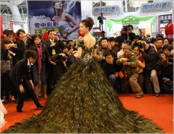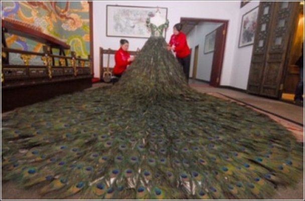 Ексклюзивне весільне вбрання коштує 1,5 мільйона доларів. В середньому павичі-самці скидають близько 200 пірʼїн в період щорічної линьки, а це означає, що виробникам знадобилося зібрати пірʼя приблизно від 10 птахів протягом року.