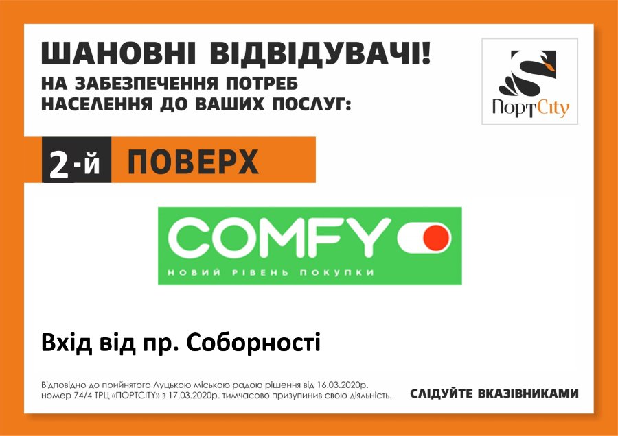 – магазин побутової техніки Comfy (вхід з боку пр. Соборності, 1 поверх ТРЦ)