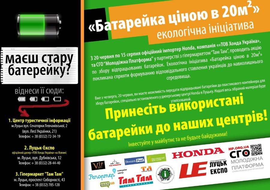 Збір побутових відходів відбуватиметься з 20 червня в межах екологічної ініціативи «Батарейка ціною в 20м²», яку реалізують компанія «ТОВ Хонда Україна» та Спілка громадських Організацій «Молодіжна Платформа» у партнерстві із гіпермаркетом «Там Там», - повідомили у прес-службі «Молодіжної Платформи».