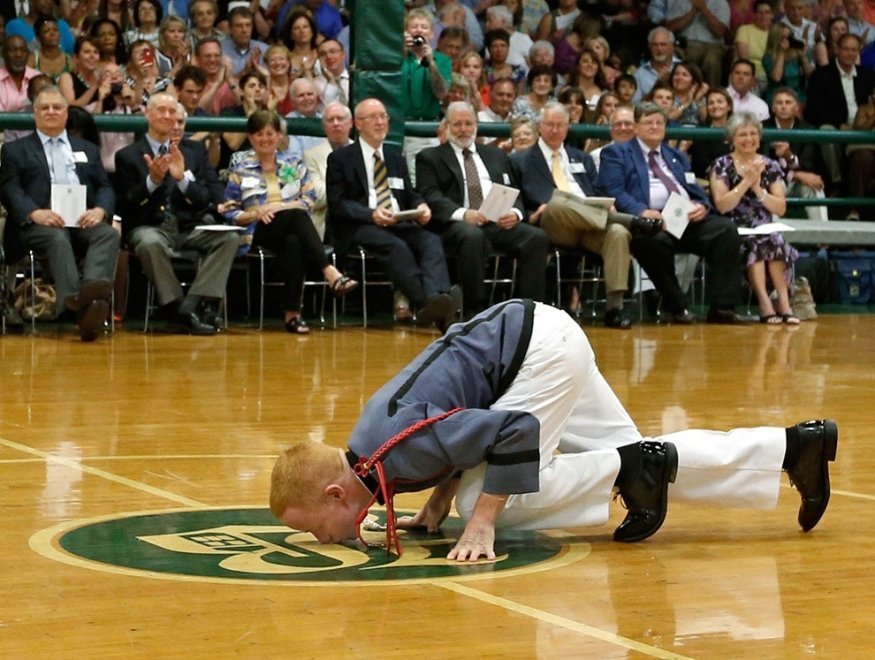 Випускник Benedictine College Preparatory Academy цілує емблему свого навчального закладу на підлозі спортивного залу перед отриманням диплома в Річмонді, штат Вірджинія, 31 травня.