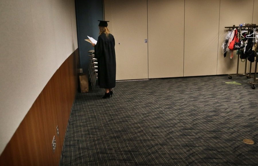 Студентка Університету Міннесоти в Рочестері репетирує свою промову перед виступом на церемонії вручення дипломів у конференц-залі «Mayo Civic Center» у Рочестері, штат Міннесота, 18 травня.