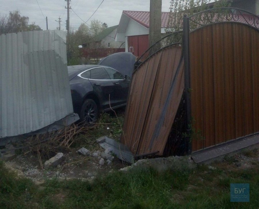 Автомобіль Tesla темного кольору зніс кілька секцій паркану та стовп, на якому, як видно з фото, знаходилася камера відеонагляду.