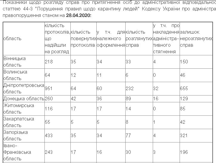Згідно із цими даними, в окремих регіонах суди ще не застосували жодного адміністративного стягнення. Це Волинська, Житомирська і Чернігівська області.