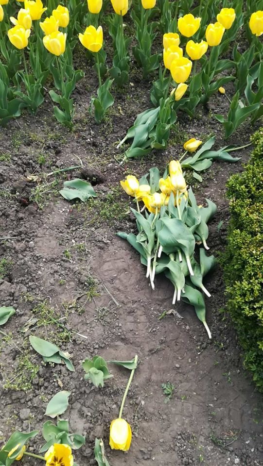 "Шановні, навіть не знаю як це назвати правильними словами? Більше 1000 тюльпанів за одну ніч було знищено у місті. Вирвані з корінням, поламані та залишені на клумбах. Правда, працівникам поліції вдалося затримати о другій годині ночі чоловіка, який вирвав з корінням більше 50 рослин. Наразі він у поліції. Керівництво тресту зеленого господарства не пам'ятає такого варварського та масштабного випадку знищення. Збитки більше 13 тисяч гривень! - повідомив Микола Прокопчук.