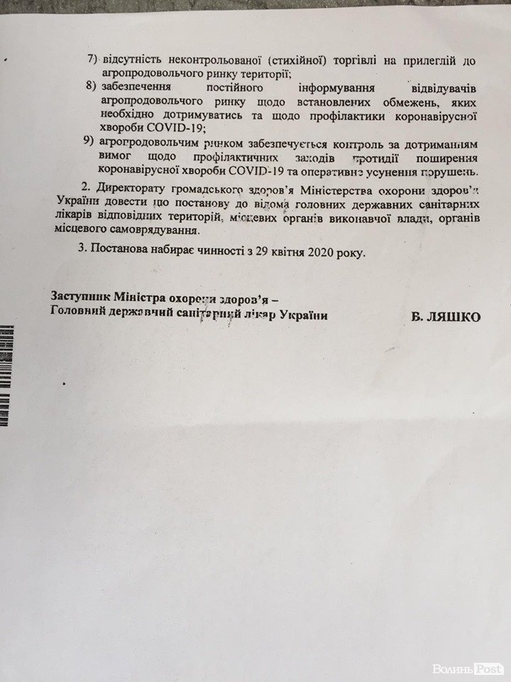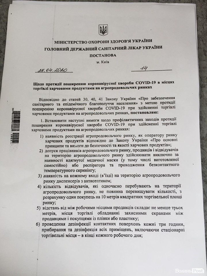 Зі слів підприємців, після виходу постанови головного санітарного лікаря України Віктора Ляшка щодо протидії поширенню коронавірусної хвороби COVID-19 в місцях торгівлі харчовими продуктами на агропродовольчих ринках країни від 27 квітня, власники торгових точок почали активно готуватися, аби торгівля відповідала усім визначеним нормам.