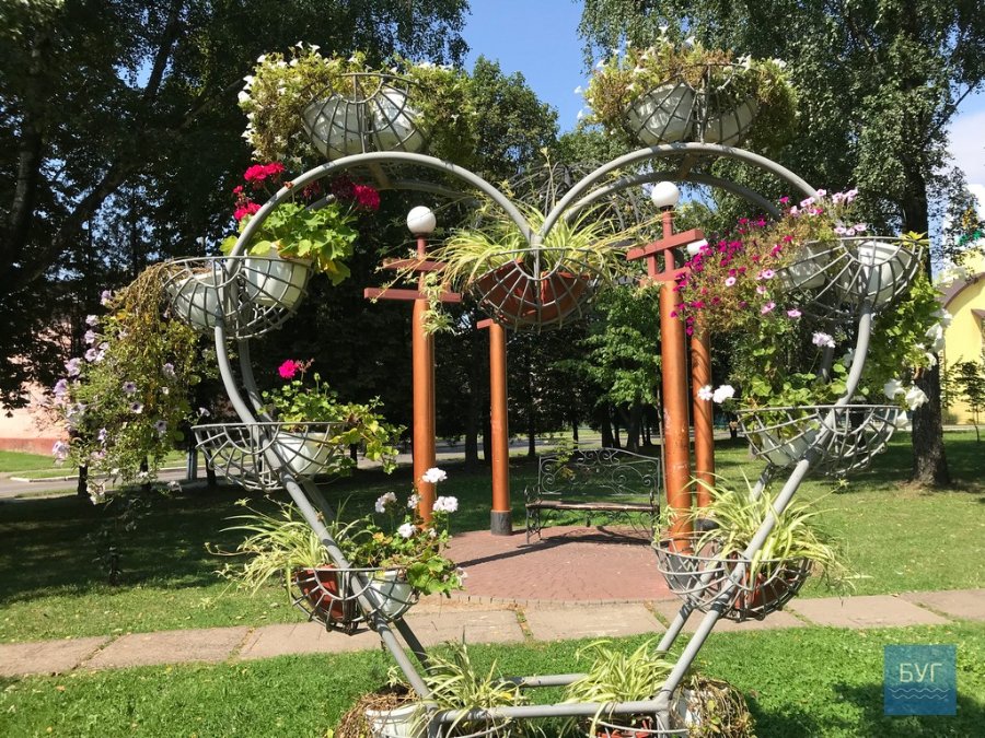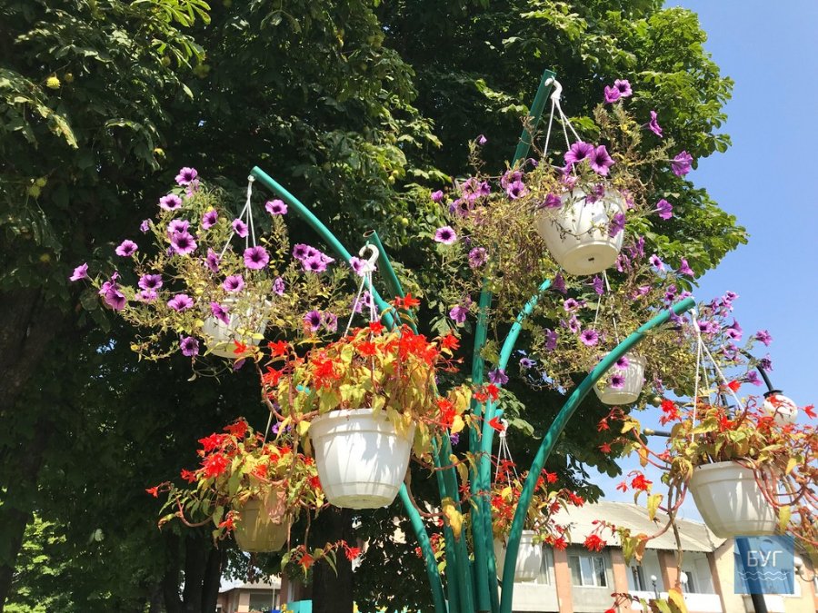 По місту розташовані різні квіткові конструкції з підвазонниками.