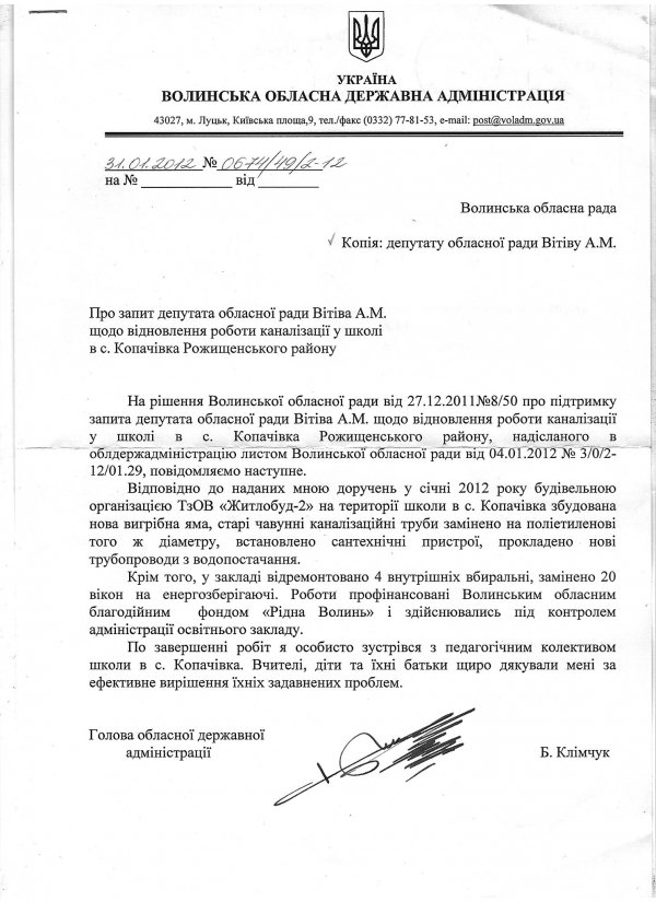 У відповіді Бориса Клімчука, зокрема, йдеться: «…на території школи в селі Копачівка збудована нова вигрібна яма. Старі чавунні каналізаційні труби замінено на поліетиленові того ж діаметру, встановлено сантехнічні пристрої, прокладено нові трубопроводи з водопостачання».