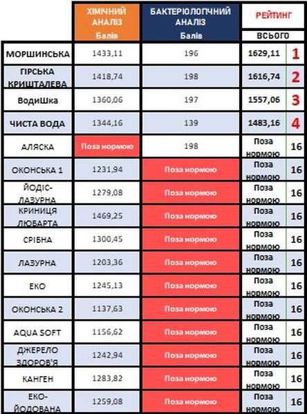 За результатами дослідження лідерські позиції зайняли дві марки бутильованої води – «Моршинська» та «Гірська кришталева». Найгірші результати отримала вода «Оконська-2». З висновками експертизи та сформованим на її основі рейтингом питної бутильованої води у Луцьку можна ознайомитися на сторінці «СВІДОМИХ» у facebook або за посиланням:https://drive.google.com/drive/folders/1LAwHrWxoFdcKe4jeTi7NbXaLofPuD98V?usp=sharing