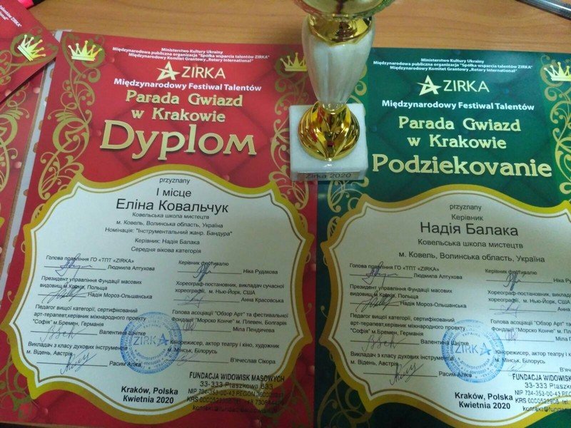 Вихованка Ковельської школи мистецтв Еліна Ковальчук взяла участь у кількох дистанційних конкурсах та показала хороші результати. Дівчина вже четвертий рік поспіль навчається грі на бандурі у Надії Балаки.