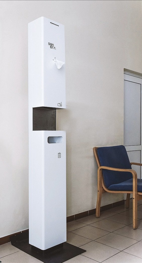 Система Saner – це комплекс засобів та інструментів для безконтактної автоматичної дезінфекції рук. Для того, аби скористатися обладнанням, варто лише підійти до Saner та піднести руки до сенсора. Система зреагує на рух і відпустить дозу дезинфікуючої речовини. За необхідності можна скористатися також серветками. Зауважимо, що літровий диспенсер Saner розрахований на 2 500 доз санітайзера. Після цього запас рідини можна оперативно поповнити.