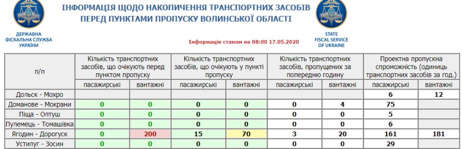 Так, за даними ДФС, станом на 08:00 ранку, перед пунктом пропуску Ягодин-Дорогуськ у чергах стоять 200 вантажівок на виїзд з України.