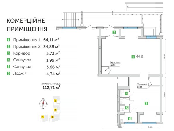 Комерційні приміщення є різного планування та площі – 78 м2, 112 м2 та 123 м2.