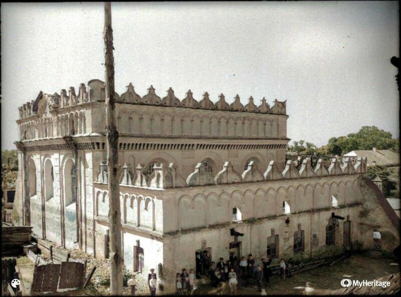 Велика єврейська синагога у м.Любомль ( збудована у 1510 р.). Вигляд із північно-східного боку сторони. Поруч місцеві жителі. Фото 30-тих років. Будівля зруйнована радянською владою у 1947 році.