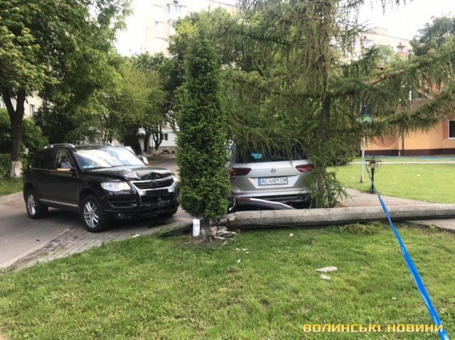 У Луцьку водійка позашляховика збила стовп та «пом'яла» припарковане авто. ФОТО