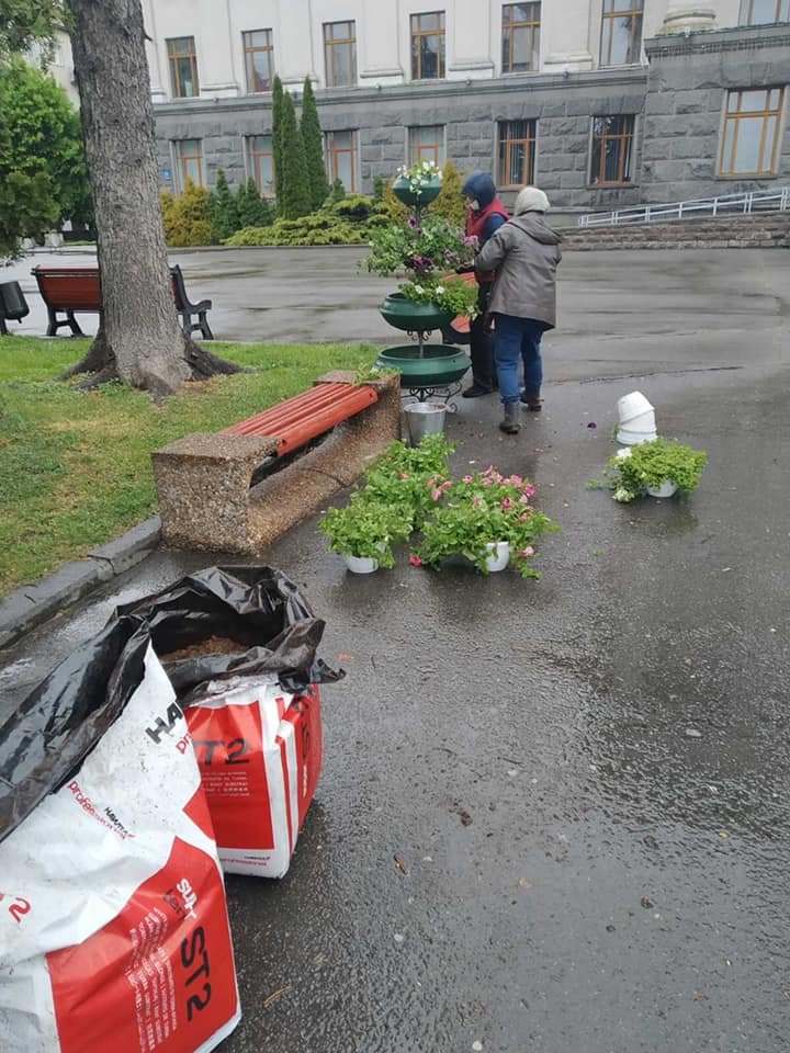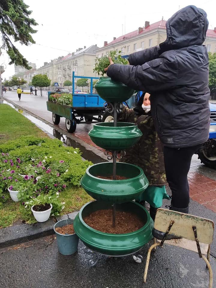 "За два дні висадили квіти в термочаші та квіткові тумби по місту. Всього 29 термочаш по пр. Волі та 44 квіткові тумби в Старому місті , на Театральний майдані, каскаді фонтанів, поруч з пам’ятником Т.Г. Шевченку, у сквері О. Алмазова.