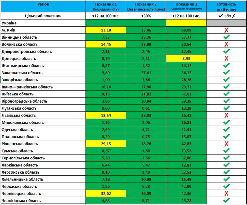 Станом на 1 червня Львівська, Волинська, Рівненська, Чернівецька і Донецька області, а також місто Київ поки що не готові до третього етапу виходу з карантину.