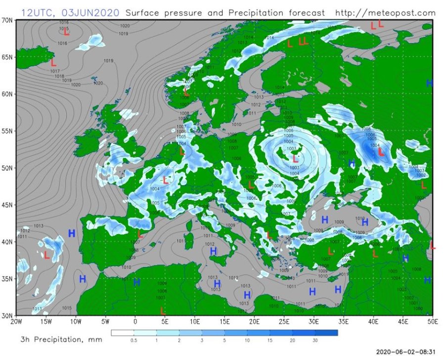У середу, 3 червня, центр циклону й надалі перебуватиме над західною частиною України. Дощі охоплять більшість областей. Суттєві потепління обіцяють з 5-го червня.