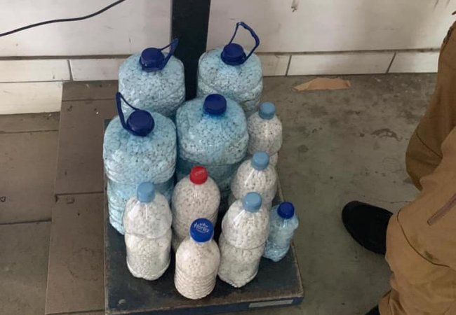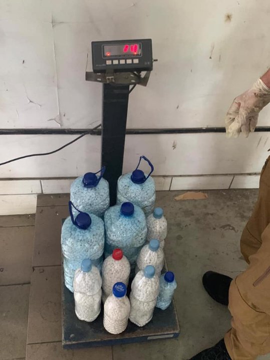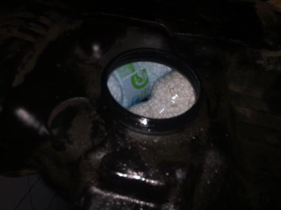 В результаті проведення повного митного огляду в легковому автомобілі марки Volkswagen, в паливному баці виявили приховані від митного контролю 11 пластикових пляшок різного об’єму із пігулками круглої форми білого кольору загальною вагою брутто 21,3 кг.