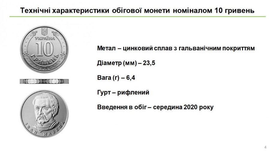 У Нова монета номіналом 10 гривень – невелика за розміром, легка. Її діаметр становить 23,5 мм, вага – 6,4 г. Вона виготовлена із цинкового сплаву з гальванічним покриттям нікелем. Завдяки своїм збільшеним габаритним розмірам (діаметр, товщина та гурт) нова 10-гривнева монета суттєво відрізняється від обігових монет номіналом 1, 2 та 5 гривень, зазначають у Нацбанку. Завдяки більшому діаметру та гурту (третя сторона монети) зі спеціальним грубим рифленням громадянам буде легко відрізнити її від обігових монет інших номіналів.