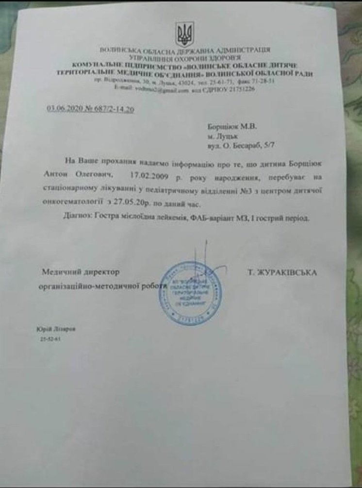 Із 27 травня до сьогодні хлопчик перебуває у педіатричному відділення №3 з центром дитячої онкогематології.