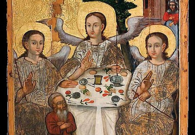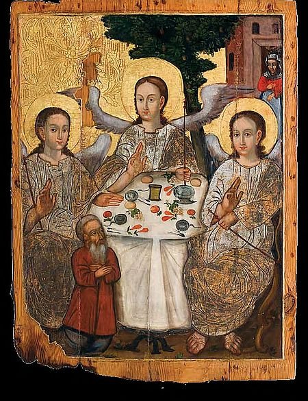 Дуже часто ікони на тему Святої Трійці зображають трьох ангелів. Сюжет іконописних зображень Трійці будується на біблійній розповіді про те, як праотець Авраам і його дружина Сарра зустріли біля діброви Мамре трьох ангелів (Бут. 18, 1-15). Для них Авраам і Сарра гостинно приготували з кращого борошна «прісні хліби», «теля ніжне і гарне», «олії і молока».