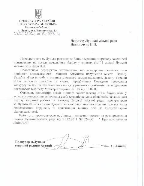 Відповідно прокуратурою надіслано протест на розпорядження голови Луцької міської ради про призначення Лаби.