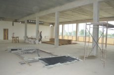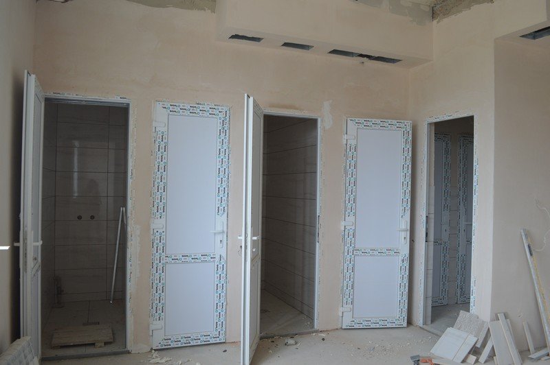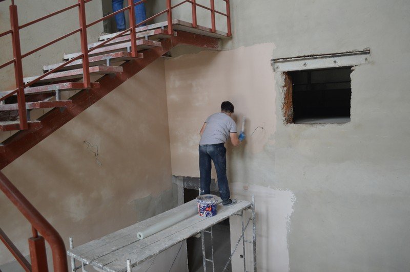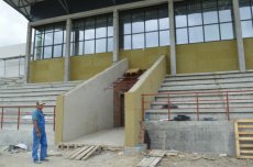 Робітники ПрАТ «Луцьксантехмонтаж №536» сьогодні працюють у підтрибунних приміщеннях. Закінчують штукатурити стіни, обкладати плиткою душові кабіни та облаштовувати санвузли. Також займаються встановленням підвіконь, на черзі — укладання паркету, монтаж стелі та оздоблення стін.