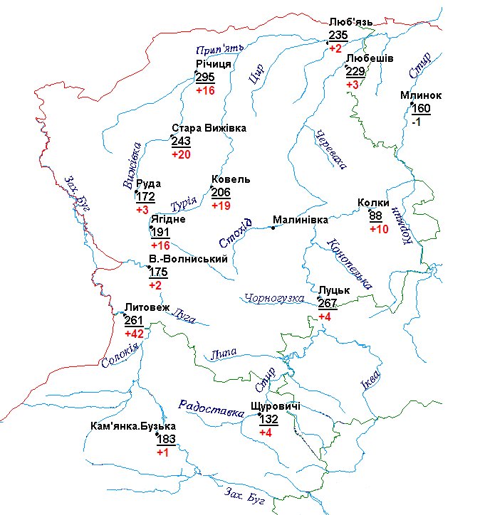 В районах випадіння значних дощів підйоми рівнів води за добу більш інтенсивні: р. Прип’ять (г/п Річиця) +16 см, р. Вижівка (г/п Стара Вижівка) +20 см, р. Стир (г/п Колки) +10 см, р. Турія (г/п Ягідне) +16 см, р. Турія (г/п Ковель) +19 см. На р. Стохід в створі поста Любешів вода продовжує утримуватись на заплаві.