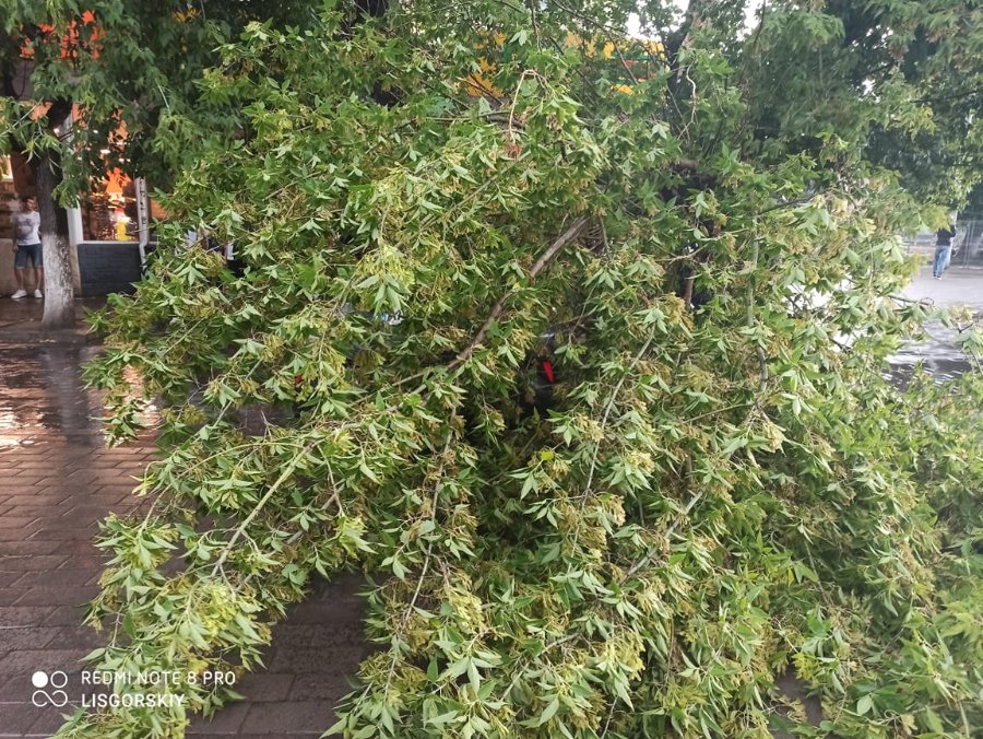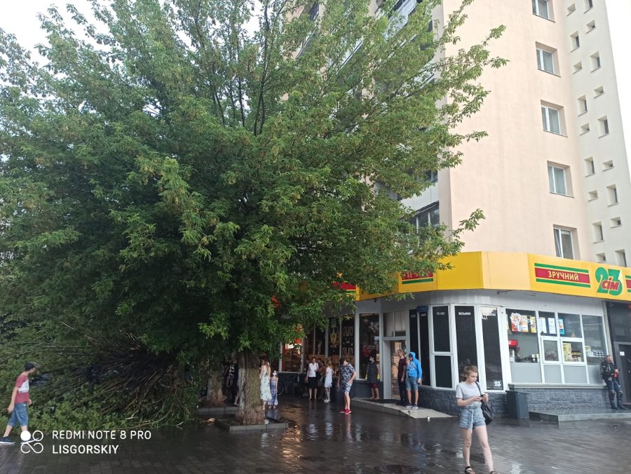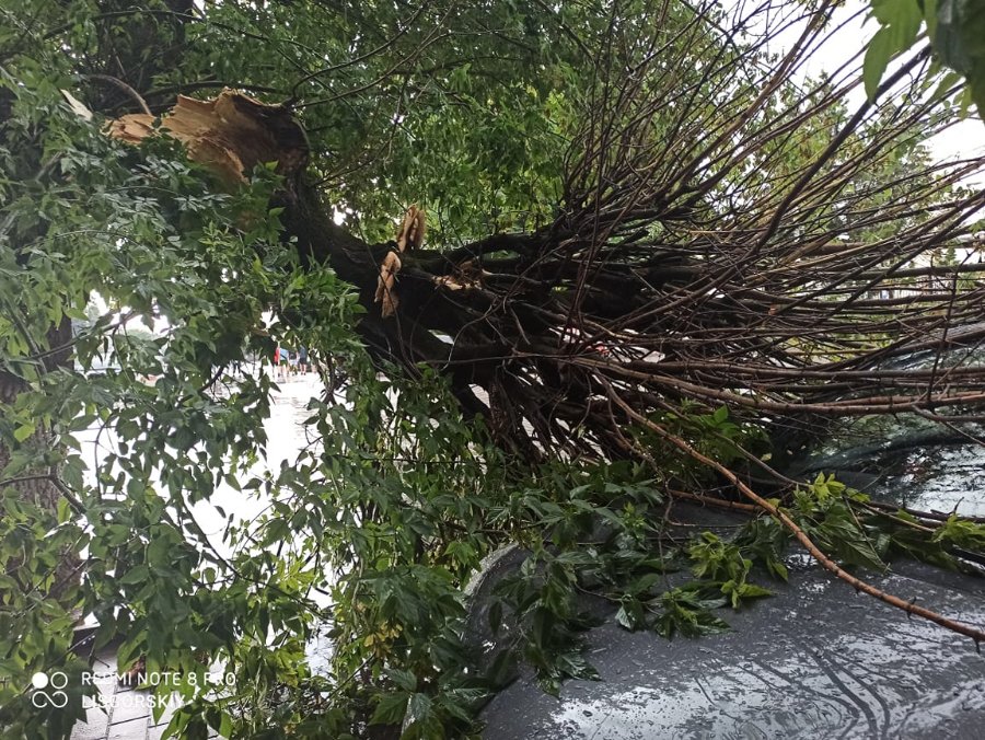 Близько 19.30 в місті розпочалася сильна злива з поривами вітру. Одна з гілок дерева біля "бім бому" в центрі Луцька не витримала навантаження на зламалася.