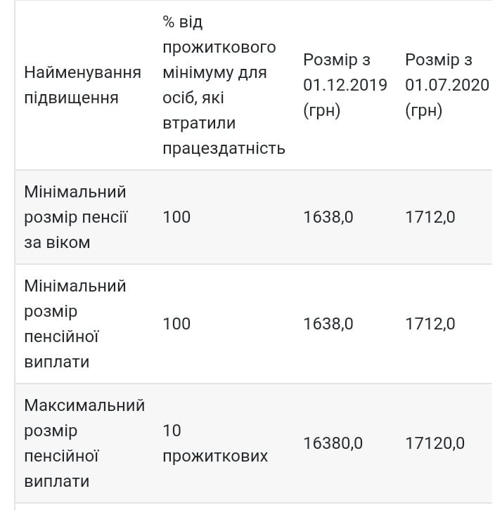 Пенсійний фонд України провів перерахунок пенсійних виплат з 1 липня 2020 року у зв’язку зі збільшенням прожиткового мінімуму для осіб, які втратили працездатність, з 1638 грн до 1712 грн, - повідомляють у Пенсійному фонді.