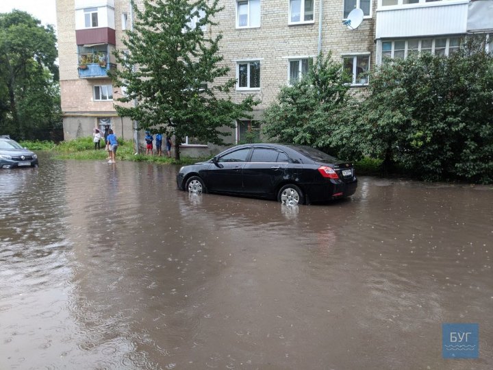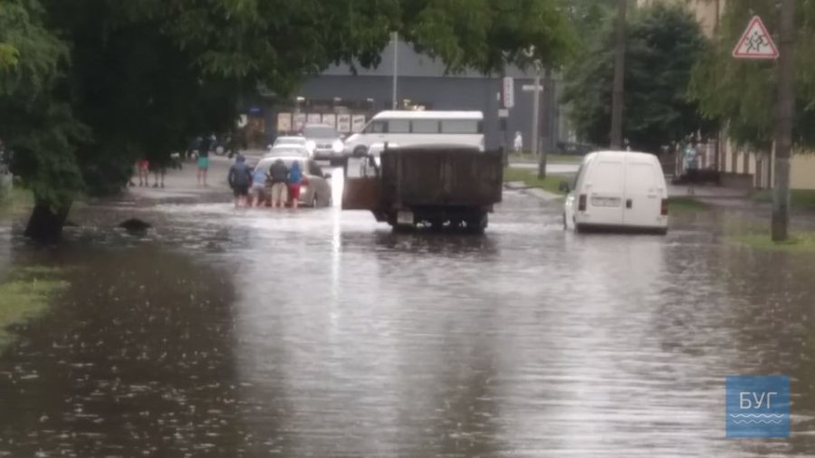 Кілька автомобілів, які були припарковані у низовині, залишилися у водному полоні. Один водій спробував виїхати, авто довелося пхати, пише БУГ.