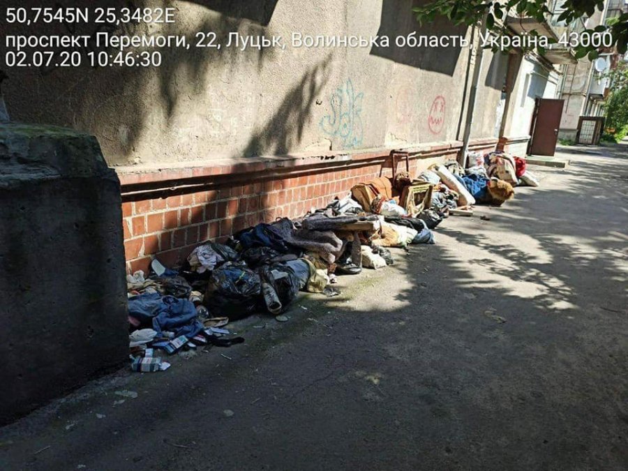 В ході реагування на звернення працівників ЖКП № 3 інспектори відділу контролю за благоустроєм та санітарним станом міста департаменту муніципальної варти Луцької міської ради виявили засмічення території загального користування побутовим сміттям, старими меблями, одягом, матрацами та подушками біля будинку № 22 на проспекті Перемоги.