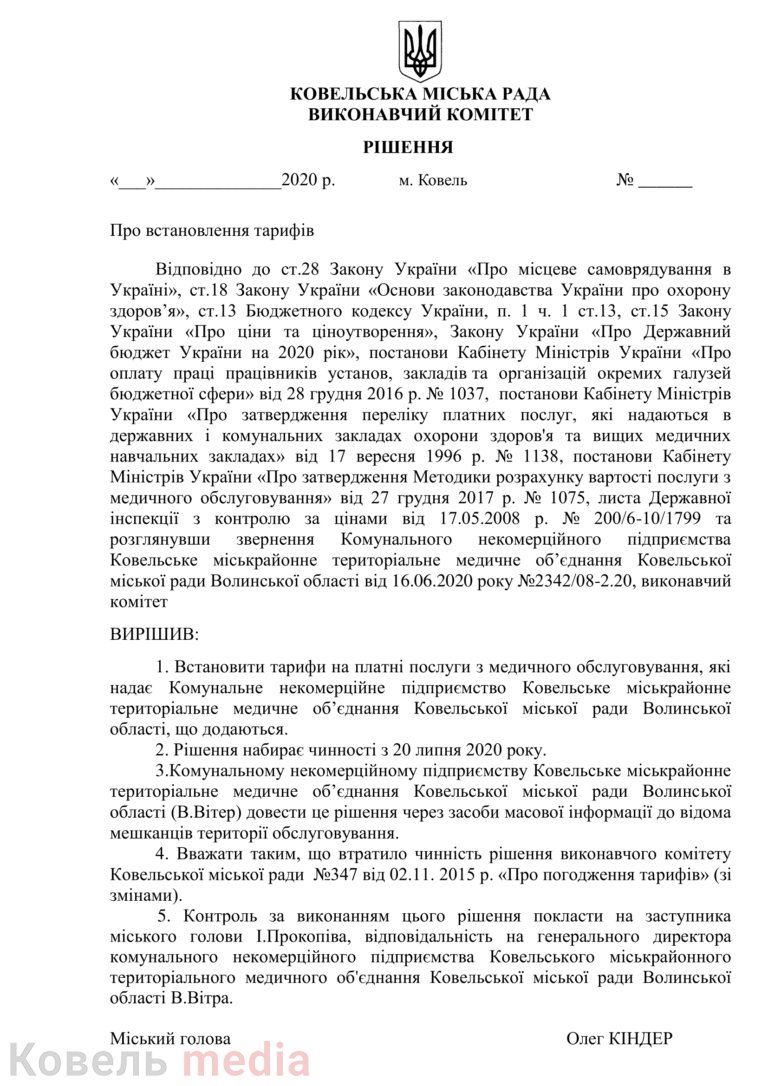 Як йдеться у проекті рішення, нові тарифи на платні послуги з медичного обслуговування, які надає комунальне некомерційне МТМО, в разі його прийняття, вступають в дію з 20 липня 2020 року. При цьому попереднє рішення виконкому Ковельської міської ради № 347 від 02.11.2015 р. «Про погодження тарифів» втратить чинність.