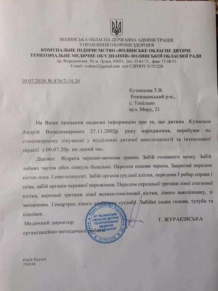 Внаслідок аварії хлопець отримав низку важких травм і перебуває у відділенні дитячої анестезіології та інтенсивної терапії Волинської обласної дитячої клінічної лікарні. Стан хлопця вкрай важкий, повідомляє Ірина Овадюк.