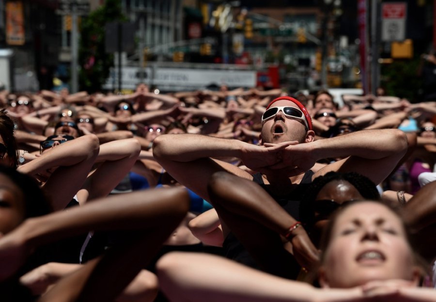 Люди дивляться на горизонт незабаром після сходу сонця 21 червня (100 км на північний схід від Скоп'є, Македонія)