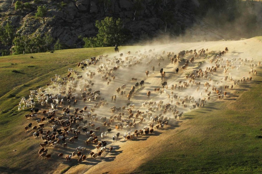 Пастух направляє стадо великої рогатої худоби, овець і кіз (Сіньцзян-Уйгурський автономний район, Китай)