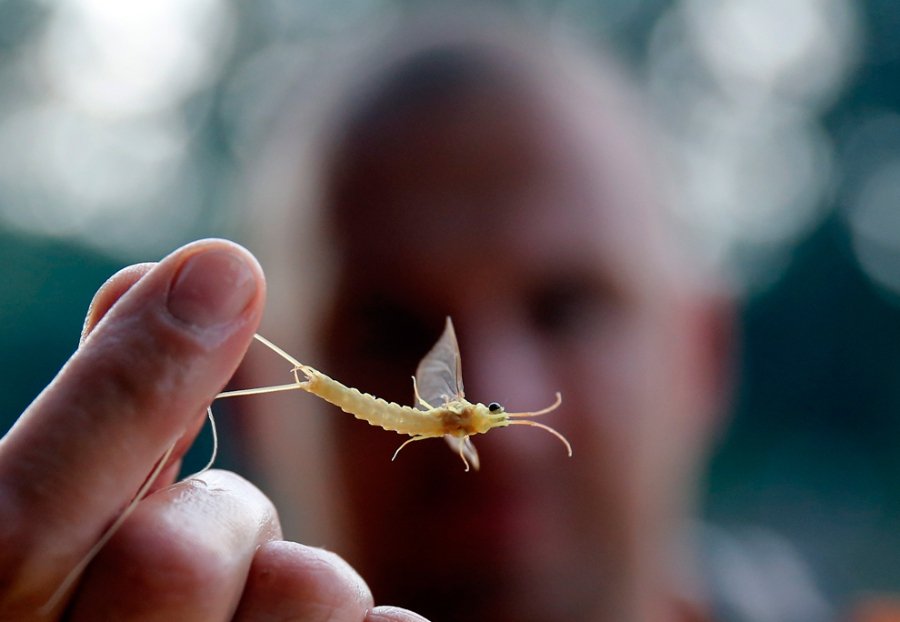 Чоловік тримає довгохвосту муху, яку впіймав на річці Тиса (135 км на південний схід від Будапешту, Угорщина)
