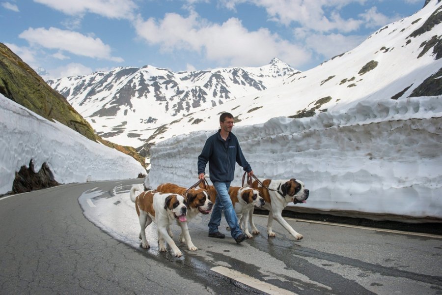 Сенбернари і співробітник Фонду Баррі Мануель Гайар переводить собак з місця зимівлі в їхню літню домівку (Швейцарія)