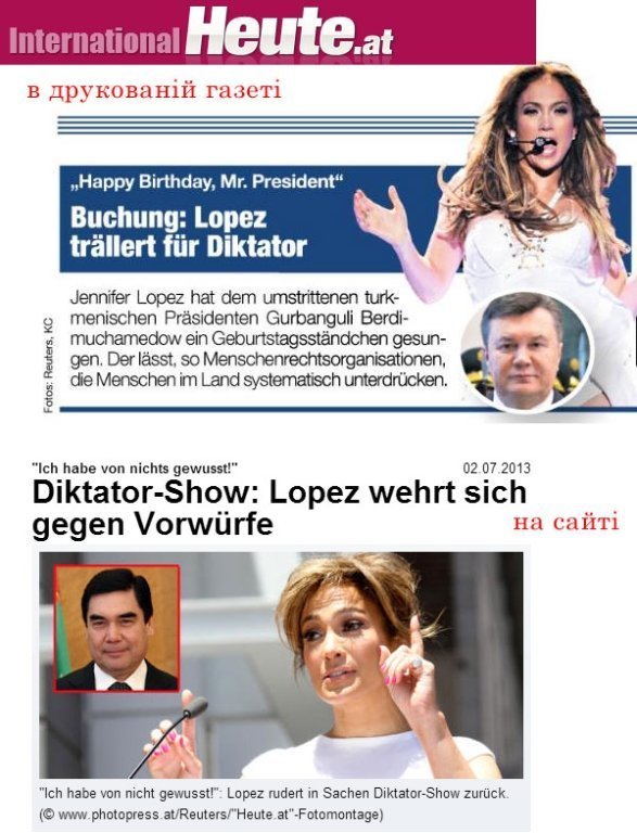 Австрійська газета Heute опублікувала статтю про день народження туркменського президента, компанію якому під час святкування склала американська співачка Дженіфер Лопез.