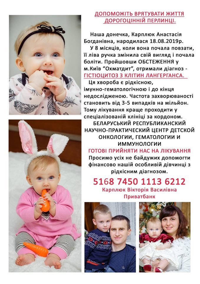 Надіслати свій внесок для можливості одужання маленької дівчинки можна на картку: 5168 7450 1113 6212 Карплюк Вікторія Василівна (мама).